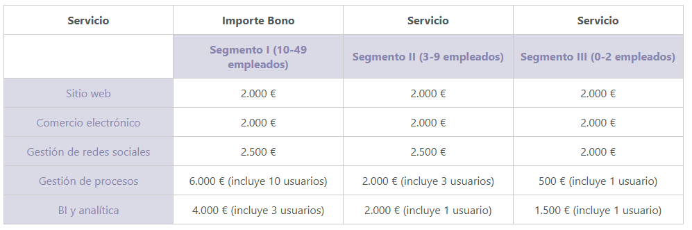 Estas empresas podrán recibir un bono hasta un máximo de 12.000€ en ayudas en función del segmento al que se encuentren, que tendrán que utilizar en la digitalización de sus negocios eligiendo las soluciones digitalizadoras del Kit Digital que mejor se adapten a las necesidades de sus negocios.